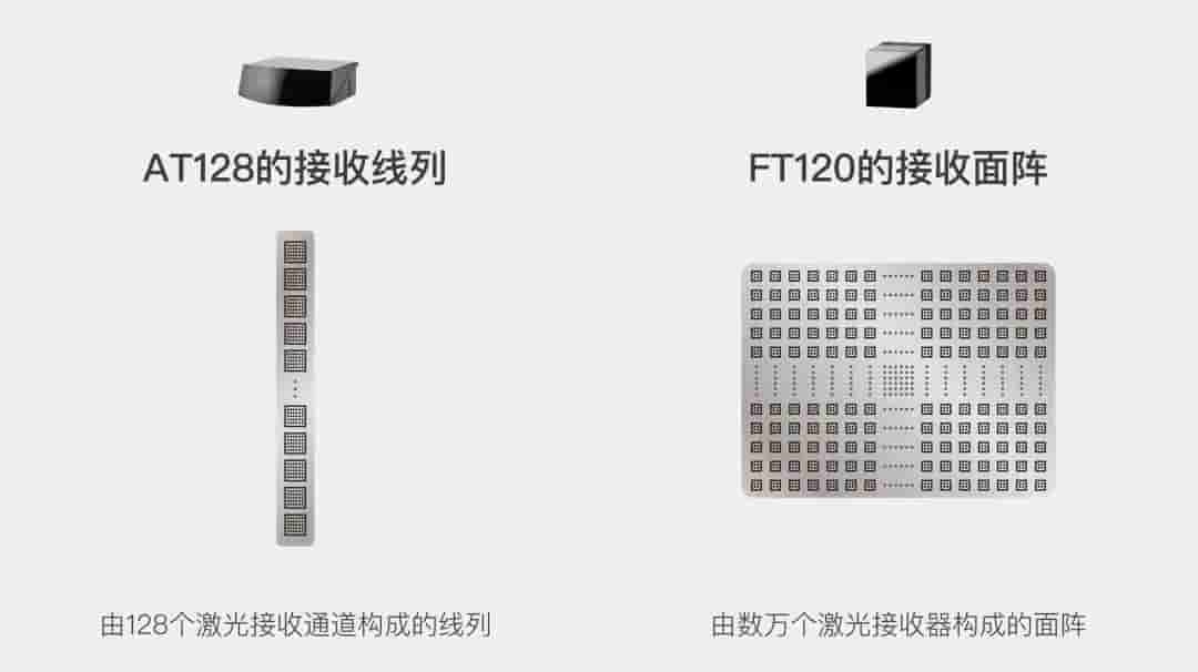 比方说,禾赛之前发布的纯固态补盲激光雷达FT120,得益于其自研多年的纯固态电子扫描技术,可以在单个芯片上集成数万个激光接收通道组成的“面阵”,从而实现更高的点云密度。