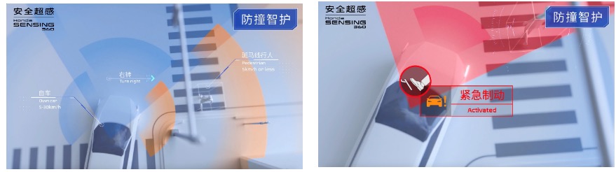 ・防撞智护:进一步扩大了监测范围,加强交叉路口对行人的守护。通过侧角雷达,感知从侧方接近的行人,前视感应摄像头追踪行人,有碰撞风险的情况下,自动实施制动。此外,还可监测对向来车和横向来车,进一步降低交叉路口碰撞风险。