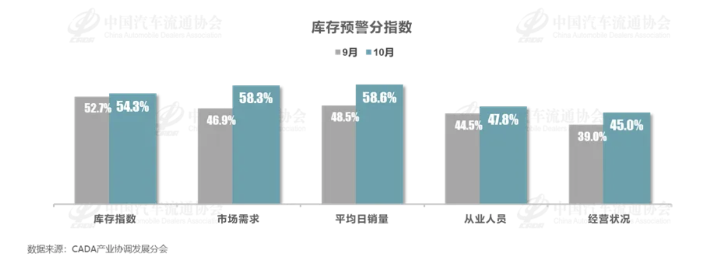在政策和营销活动的双驱动下,门店客流及订单得到大幅增长。从库存预警分指数情况看:10月市场需求、平均日销量、从业人员、经营状况指数均呈环比上升态势。中国汽车流通协会预计,10月乘用车终端销量在225万辆左右,将实现同比和环比双增长。
