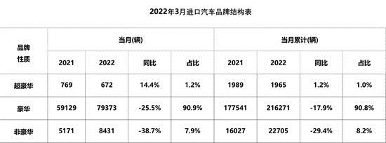 流通协会表示,在进口车整体消费升级的趋势下,消费需求向超豪华品牌聚集,低价普通品牌因国内产业链优势纷纷选择国产,甚至退出进口车市场。数据显示,虽然3月整体进口车市场销量下滑26.5%,但超豪华品牌逆势增长14.4%,而豪华品牌和非豪华品牌分别下滑25.5%和38.7%,分化严重。从1-3月累计数据看,进口超豪华及豪华品牌占比91.8%(其中超豪华品牌占比1%),进口车继续夯实高端细分市场定位。