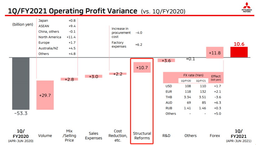 三菱第一财季优异的业绩表现一定程度上得益于该公司通过削减成本恢复盈利能力的结构性改革。该公司曾希望在两年内将总固定成本降低20%,但仅用了一年就实现了这一目标,在美国等地区加强数字营销等帮助三菱控制了成本。总的来说,结构改革使三菱的季度营业利润增加了107亿日元(合9680万美元)。