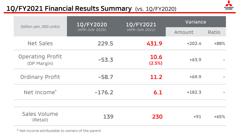 具体说来,在截至今年6月30日的第一财季,三菱汽车实现了106亿日元(合9590万美元)的营业利润,而去年同期营业亏损533亿日元(合4.82亿美元)。净利润为61亿日元(合5520万美元),而去年同期净亏损1762亿日元(合15.9亿美元)。