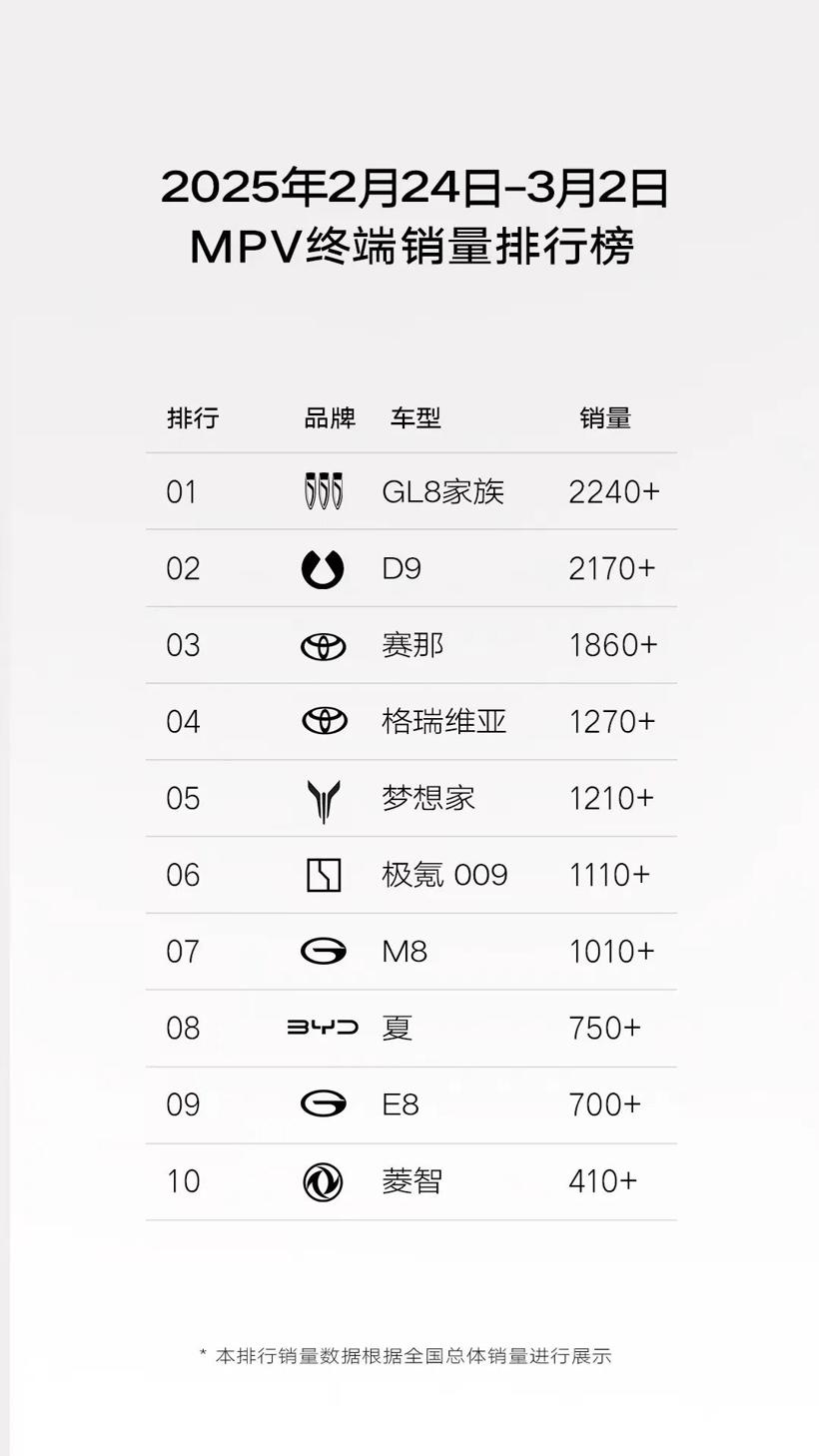 2024年销量前十的MPV中,插混车型占据五席,包括腾势D9、岚图梦想家、传祺E8等自主车型,通过插混技术解决了MPV的续航焦虑与油耗问题,让自主MPV成为市场主流选择,使得合资品牌需要不断在价格与技术上突破以应对挑战。