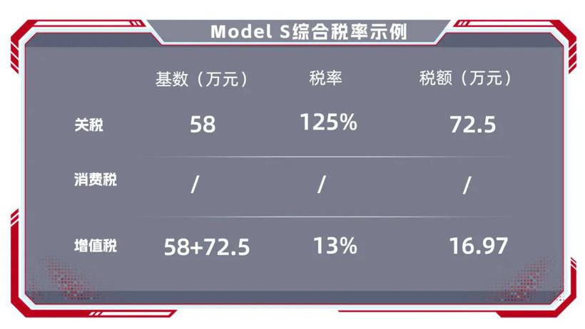 具体来看,以特斯拉Model S为例,其在美国起售价为79990美元(约合人民币58万元),假设这个价格为到岸价,那么进口关税为58×125%=72.5万元。