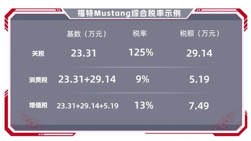 那么这个假设到岸价为23.31万元的福特Mustang,预计在国内要交的税为:29.14万元关税+5.19万元消费税+7.49万元增值税=41.82万元。而在关税涨之前,福特Mustang只需要交15%的关税,所有的税不到10万元,大家应该能感受到这个差距了。