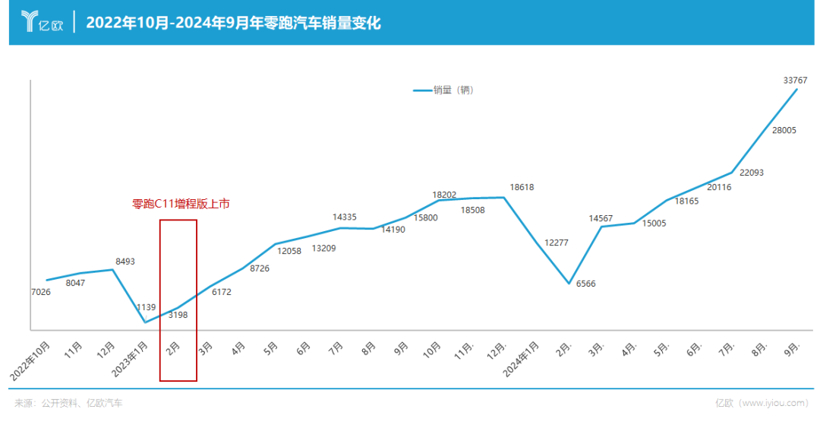 从零跑汽车自身销量变化,也能看出增程汽车带给零跑汽车的赋能。2023年第一季度,零跑汽车首款增程车型——零跑C11增程面世。此后,零跑汽车的销量如同坐上火箭,一路飙升。